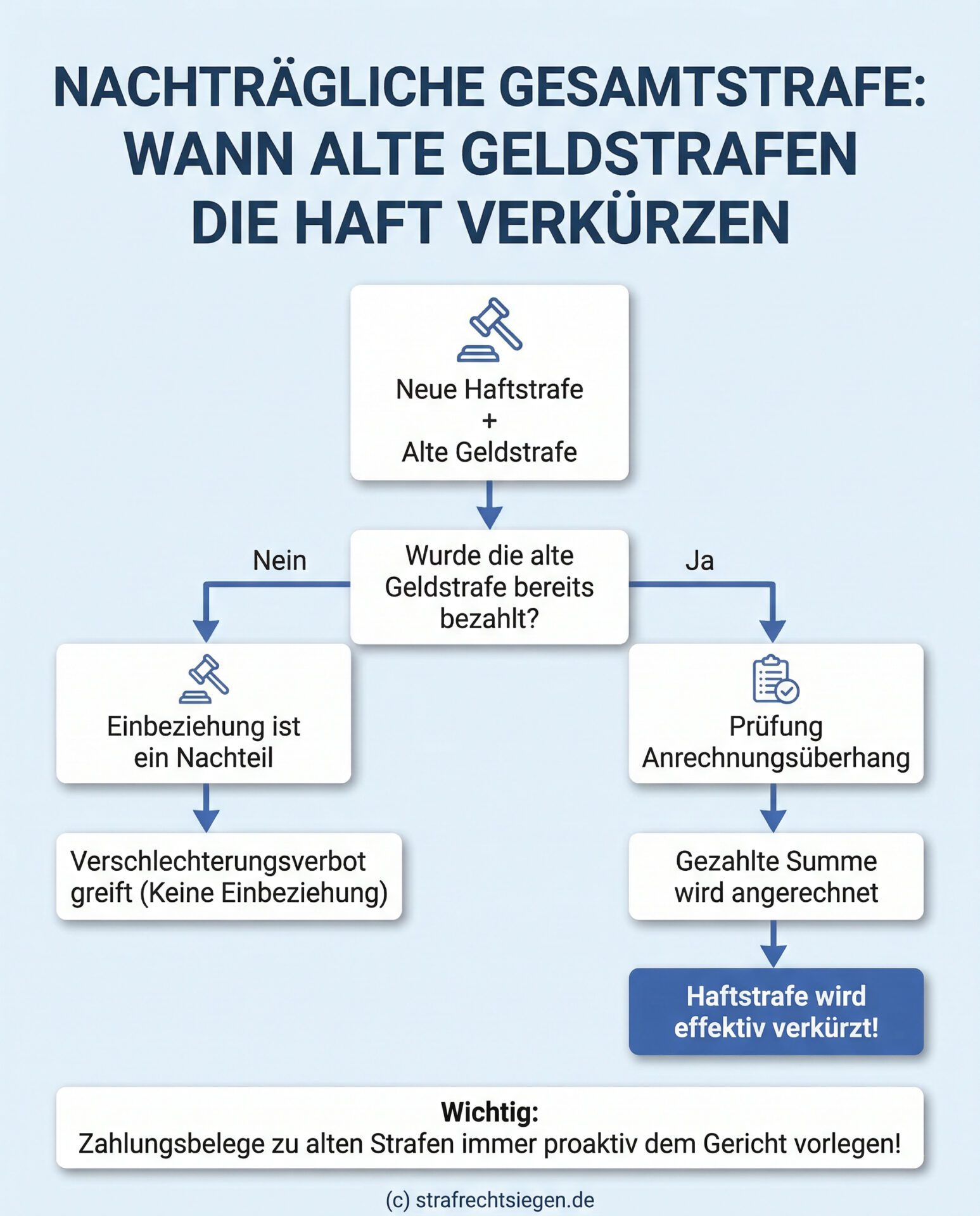 Das Gericht muss zwingend prüfen, ob eine frühere Verurteilung zum Zeitpunkt der neuen Tat bereits rechtskräftig war und deshalb in die Gesamtstrafe einbezogen werden muss. Gemäß Paragraf 51 Absatz 2 des Strafgesetzbuches (StGB) sind bereits geleistete Zahlungen auf die neue Strafe anzurechnen, wodurch sich Ihre tatsächliche Haftzeit spürbar verringern kann. Ein solcher Vorteil entsteht insbesondere durch einen sogenannten Anrechnungsüberhang, wenn die gezahlte Summe höher ausfällt als der für diese Tat neu berechnete Strafanteil. Daher sollten Sie dem Gericht unbedingt alle Zahlungsbelege vorlegen, damit die erbrachten Zahlungen im Urteil oder im nachträglichen Beschlussverfahren berücksichtigt werden.