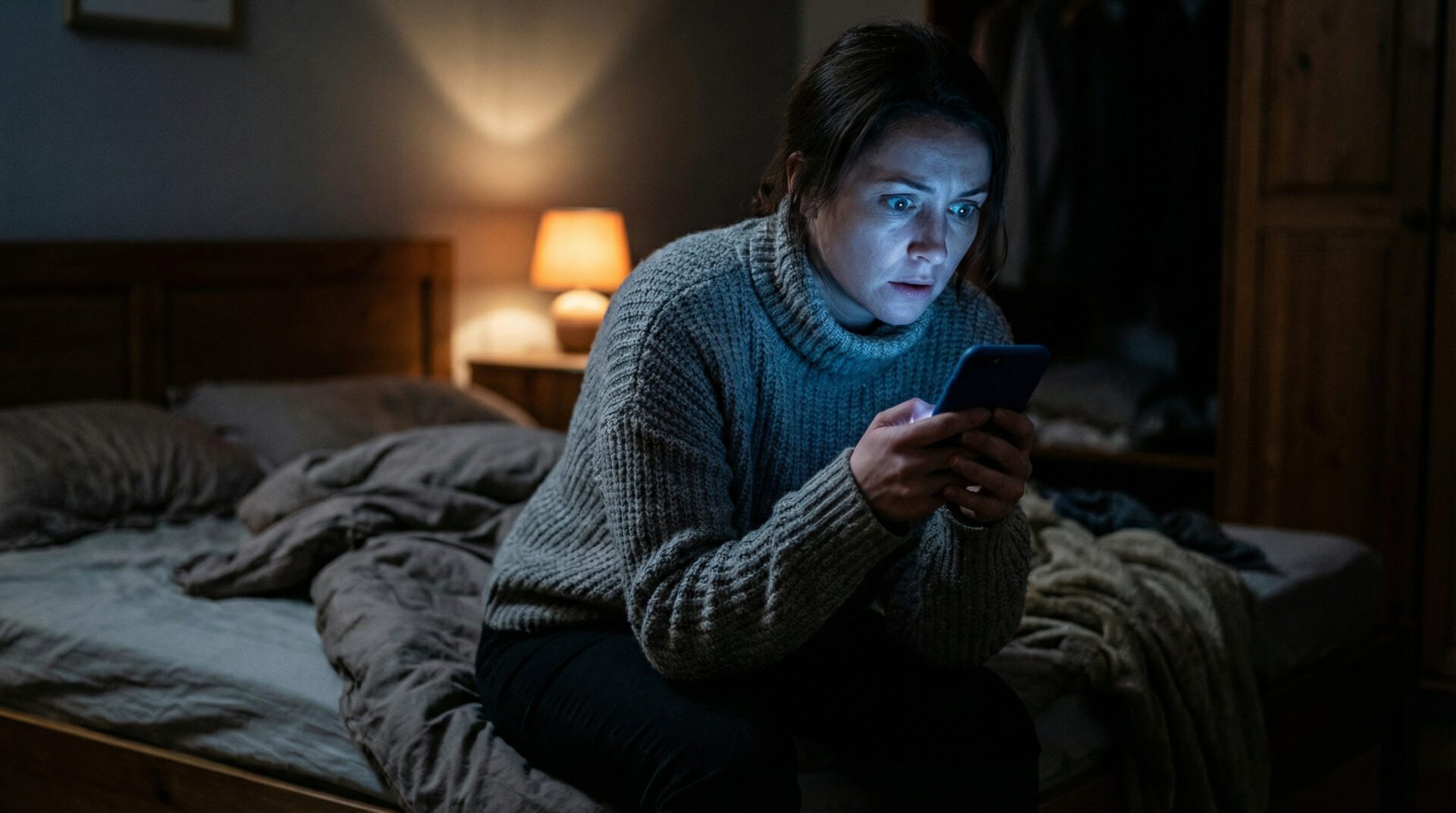 Eine Frau sitzt nachts auf der Bettkante und blickt schockiert auf ihr hell leuchtendes Smartphone, das ihr Gesicht in kaltes Licht taucht