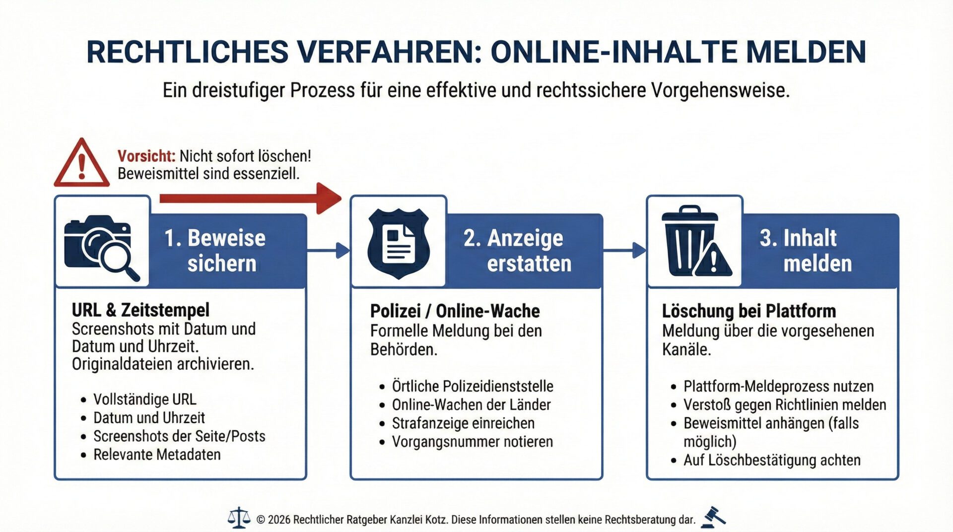 Infografik zum korrekten Ablauf bei digitaler Gewalt: 1. Beweise sichern, 2. Anzeige bei der Polizei, 3. Meldung an die Plattform zur Löschung. Warnhinweis: Vorheriges Löschen vernichtet Beweise.