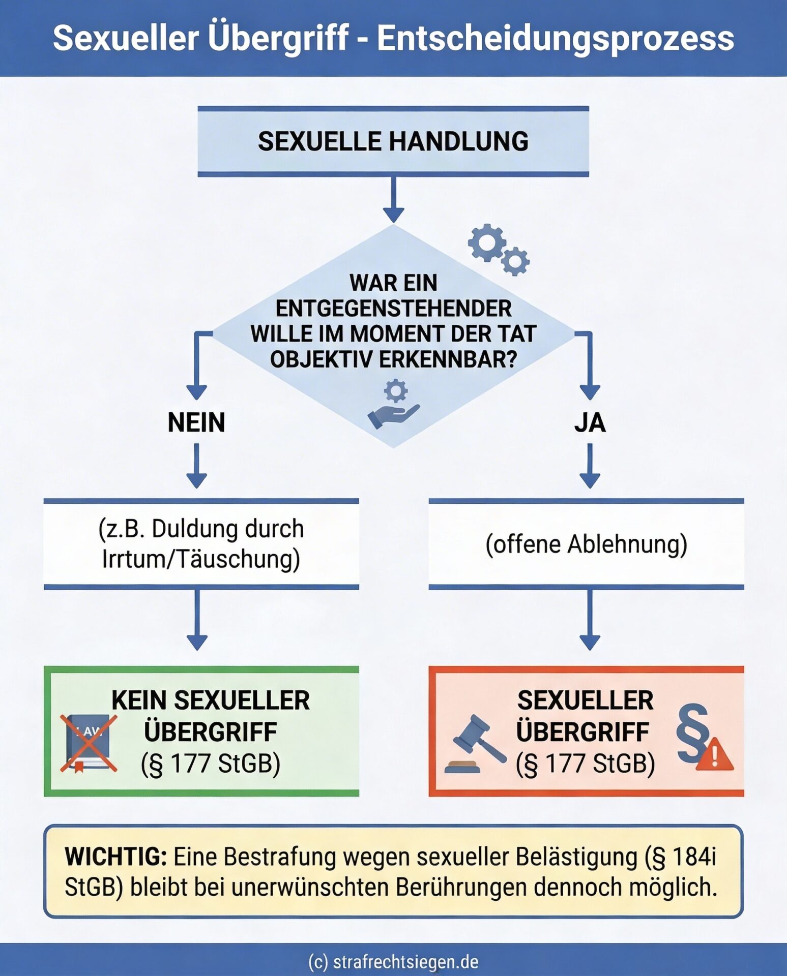 Die Vorschrift des § 177 StGB basiert auf dem Grundsatz, dass sich der Täter über einen für ihn wahrnehmbaren Widerstand oder eine Ablehnung hinwegsetzen muss. Wenn das Opfer die Situation aufgrund einer Täuschung zunächst duldet, existiert aus Sicht des Täters während der Tat kein erkennbares Nein. Ohne diese zum Tatzeitpunkt deutlich tretende Ablehnung lässt sich ein sexueller Übergriff juristisch nicht begründen, selbst wenn der Irrtum erst nach der Tat bemerkt wird. Die Rechtsprechung verweigert in diesen Fällen eine rückwirkende Fiktion des Widerstandswillens, da die Arglosigkeit des Opfers rechtlich nicht als ein aktiv geäußerter Widerspruch gilt.