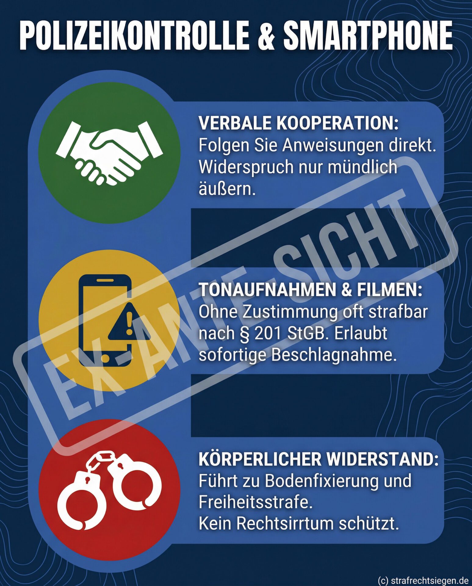 Um eine Verurteilung oder eine Eskalation zu vermeiden, sollten Sie bei einer Kontrolle folgende Regeln befolgen: Leisten Sie Anweisungen (z.B. Aussteigen, Handy-Herausgabe) sofort Folge. Äußern Sie Ihren Widerspruch gegen die Maßnahme nur verbal, niemals körperlich. Verzichten Sie auf Schimpfworte oder abfällige Kommentare über die Beamten. Falls Sie nichts tun und die Maßnahme physisch blockieren, riskieren Sie eine mehrmonatige Freiheitsstrafe und körperliche Verletzungen durch rechtmäßige Zwangsmittel der Polizei.