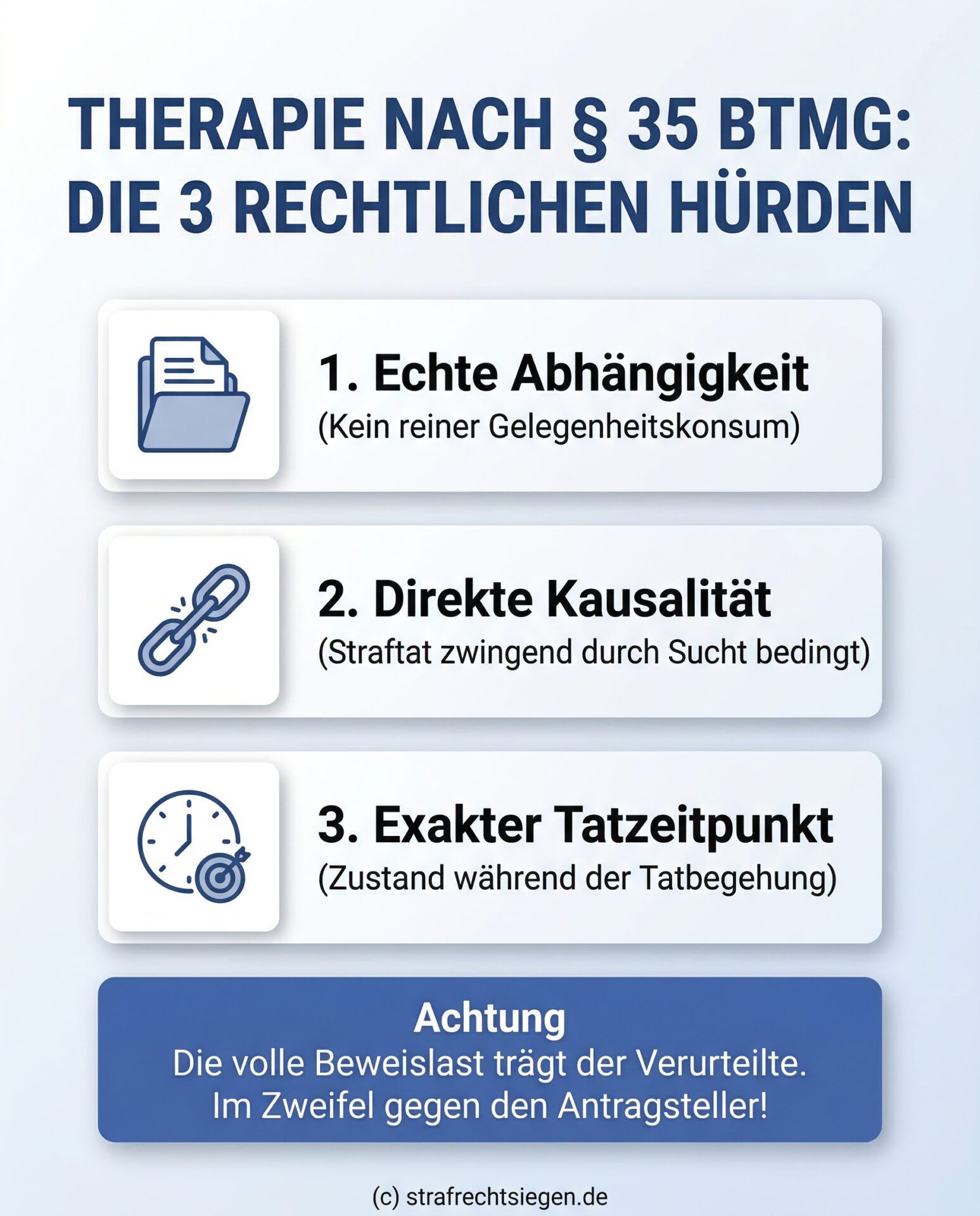 Infografik: Die 3 rechtlichen Hürden für eine Therapie nach § 35 BtMG (Sucht, Kausalität, Tatzeitpunkt) inkl. Beweislast.