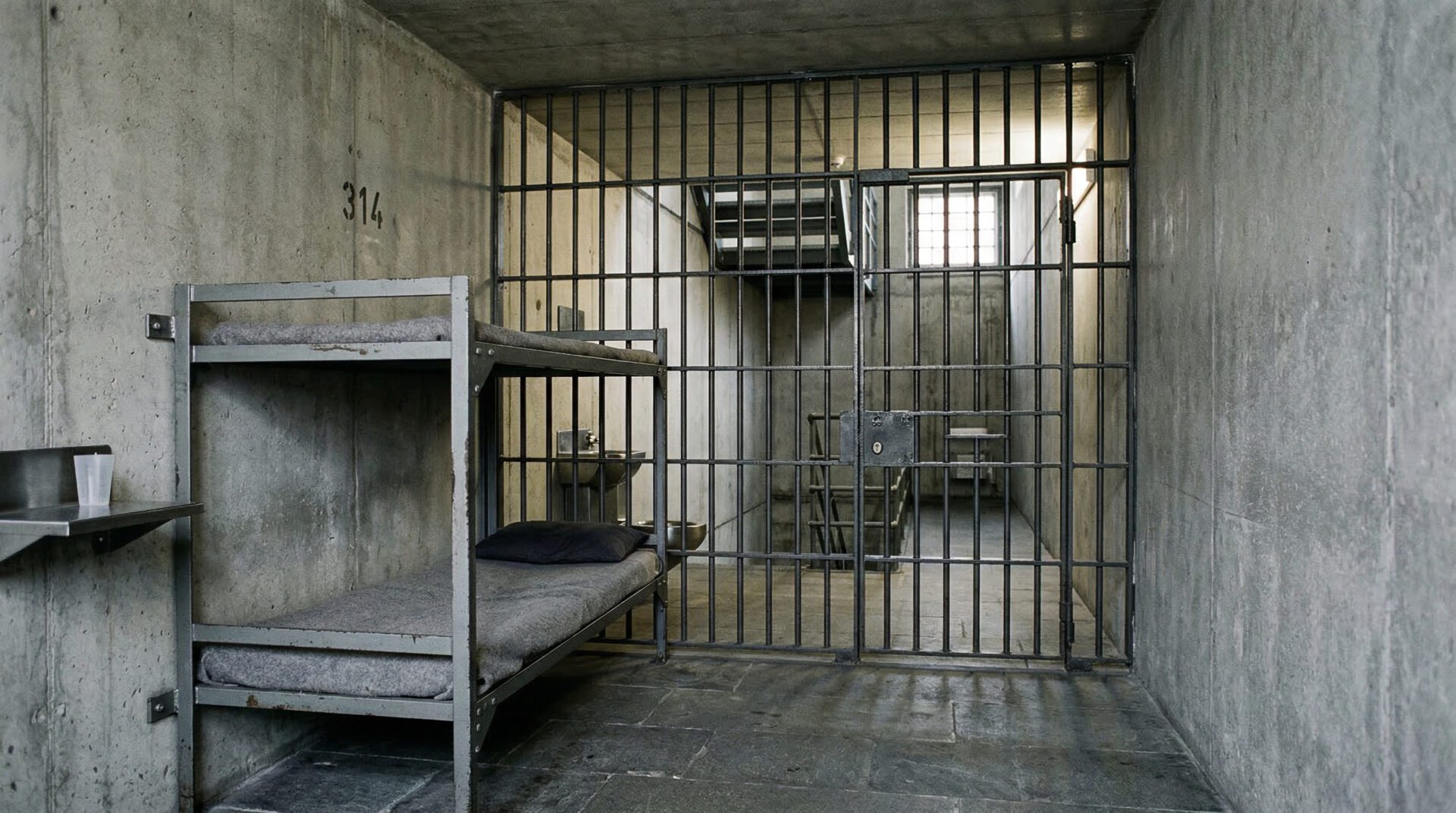 Karge deutsche Gefängniszelle mit massivem Stahlbett, grauen Betonwänden und dicken Gitterstäben im Vordergrund.